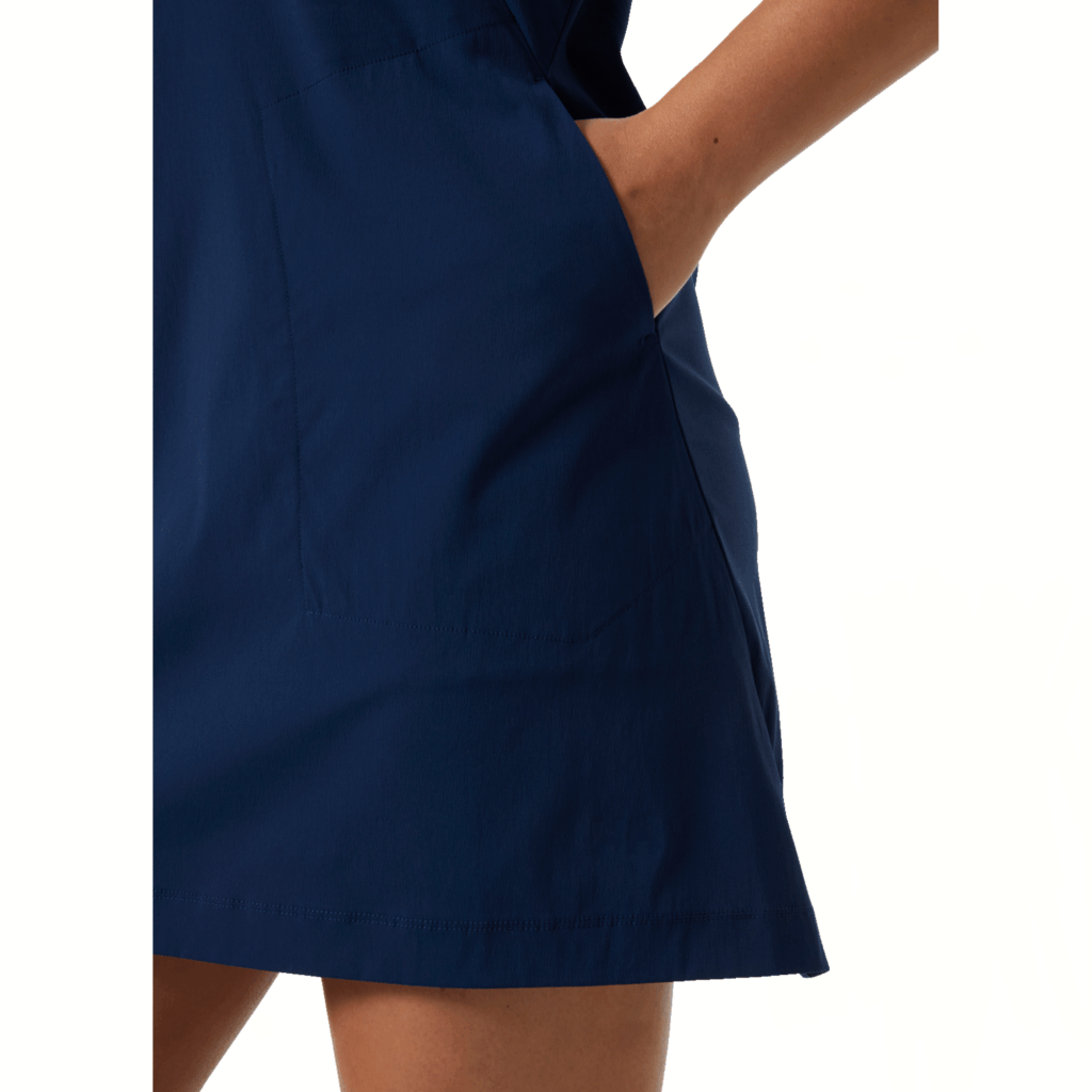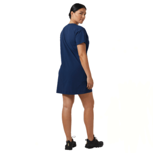 This short sleeve T-shirt dress is a cute yet functional option for spring and summer activities such as hiking or traveling, featuring 50 UPF for solar protection in both wet and dry conditions. Made from a lightweight and quick-drying fabric with 2-way stretch and breathability. It includes two open pockets and a relaxed fit, with a high neckline for added protection from the sun. The semi-technical fabric is a blend of polyamide and elastane, making it lightweight, comfortable, and cool to wear. This dress contains recycled material. See composition for more details.